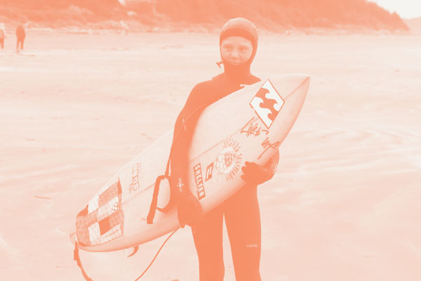 Everyday, Mathea takes a twominute scamper through the woods and scans the ocean. Ifthere’s surf, she’s on it. Remarkably grounded, this bright, outstanding young ripper is working hard to progress her surfing, a sport Canada is not so wellknown for. But, keep an eye out for little Thea, she’s keen, clever and committed, and the future looks bright!